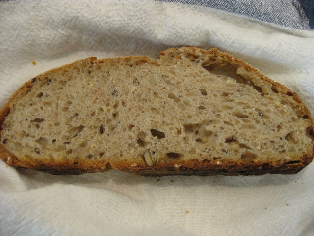 First I thought this week I was going to bake only the sourdough loaf. So I refreshed my sourdough a few times at the beginning of this week so it was strong for the baking. On Tuesday night I put together all ingredients (sourdough, Allison seeds flour, rye flour, water, salt and some extra seeds) I mixed everything, left it an hour or two in the kitchen and then I put it in the oven until yesterday when I baked it. Why am I not happy with it? Two reasons and both my fault. First of all I moved the dough after I let it seat for a second time. This morning when I cut the bread I found few big holes (bubbles) inside. This is not so important because the bread tasted the same with or without holes but it is not nice. Second reason is that because it was the last loaf to go into the oven, and I was doing many things at the same time, I forgot about the oven and the bread and instead of having it 10 minutes with the heat coming out only from the bottom of the oven (at 250ºC) I had mine 30 minutes before I saw what was happening. I did smell it in advanced but I didn't think it could be the bread. Well the bottom of the loaf is a bit "dark". It is also not that important because it is only the crust at the bottom and I baked worse loaves, but it is not nice.